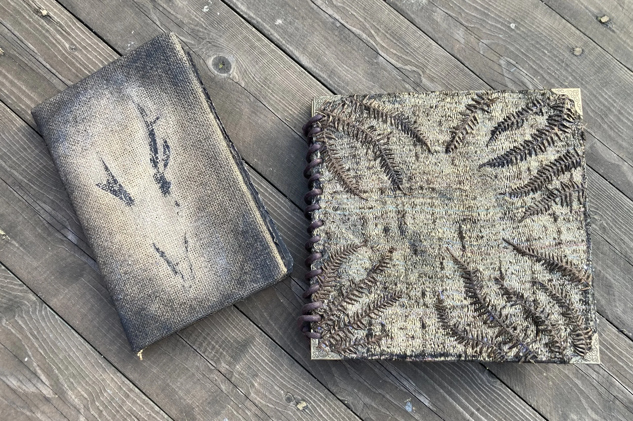 Dried fern leaves, hessian and ink were used to create the two grimoire covers.