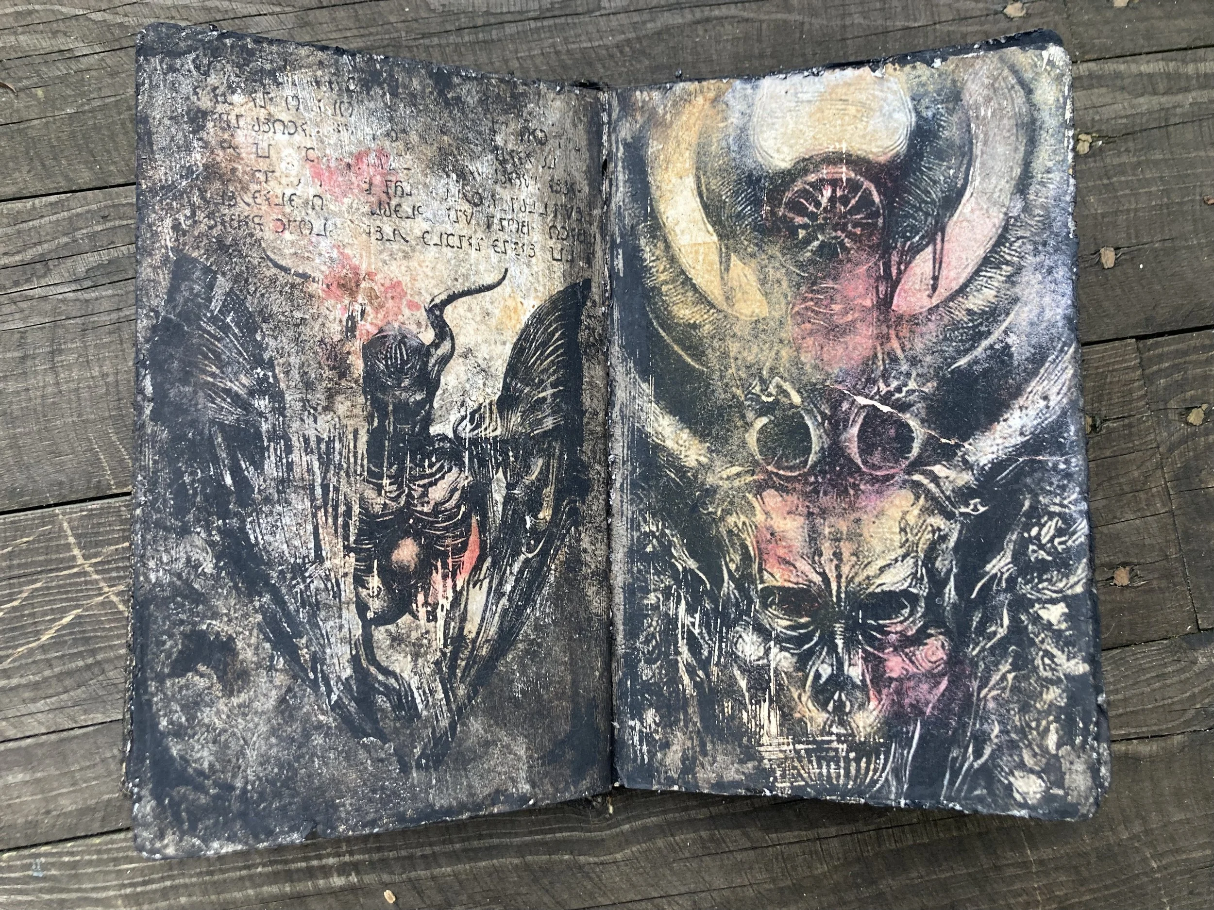 images were sourced, transferred, aged and laced into the fern covered grimoire suggesting spells and recipes for all things nefarious.